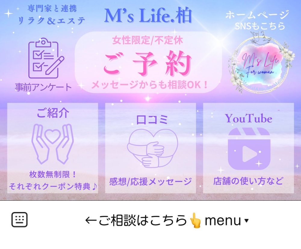 | クーポン取得 (女性) | サロンで使える 🌸クーポン(イベント&毎年発行) 🌸回数券(ご希望者様) 発行と管理もこちらからどうぞ🌈 |